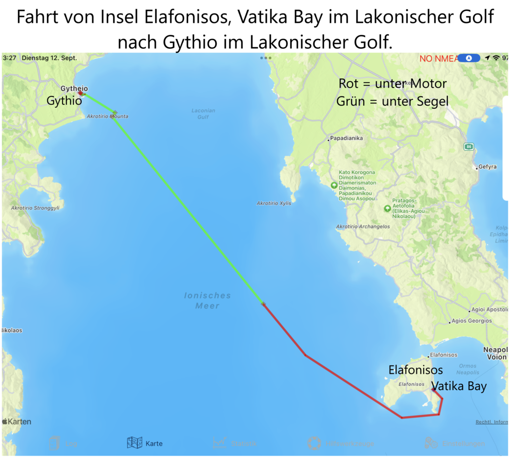Nach diesen Tagen freuten wir uns auf unser nächstes Reiseziel, den Ort Gythio und hoben daher vor dem Frühstück den Anker und nahmen unseren Kurs zu unserem Zielort auf. Frühstück gab es nachdem der Kurs gesetzt war, da wir das erste Stück unter Motor fuhren.