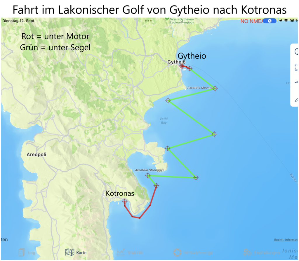 Kotronas war für uns nur ein Zwischenstopp zu unserem nächsten Ziel. Aufgrund seiner Lage ist Kotronas der ideale Absprungort, um das Kap Tenaro zu umfahren und in den Golf von Messiniakos einzufahren, wo unser nächstes Ziel lag.