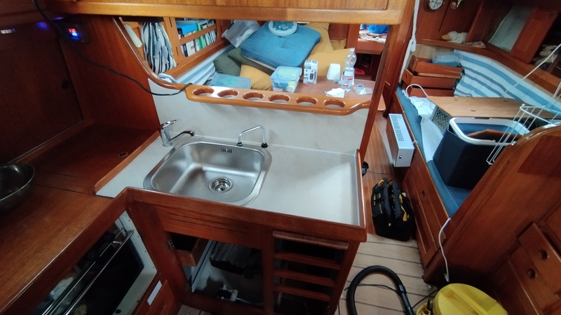 Wir haben eine neue Spüle montiert und den Wasserhahn und Seewasserhahn ausgetauscht. Der Bereich um das Spülbecken wurde mit Vinyl ausgelegt, jetzt ist der Bereich vor Spritzwasser geschützt.