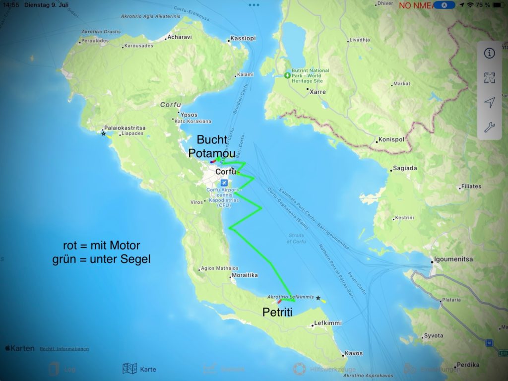 31.05.2024 Start: Griechenland, Festland, Insel Korfu, Bucht Potamou vor Stadt Korfu bei Fährhafen Ziel: Griechenland, Festland, Insel Korfu, Ankerbucht vor Petriti Fahrzeit 6,7 Stunden, Strecke 22,5 sm davon 0,7 sm unter Motor und 21,8 sm unter Segel |