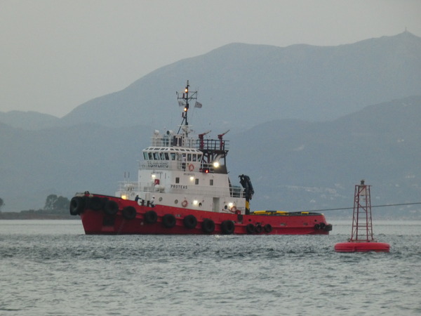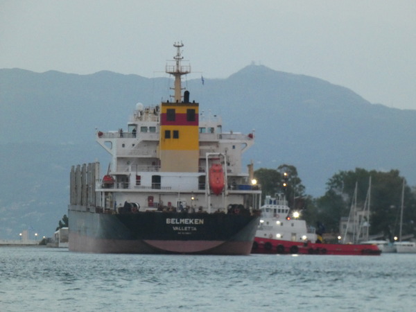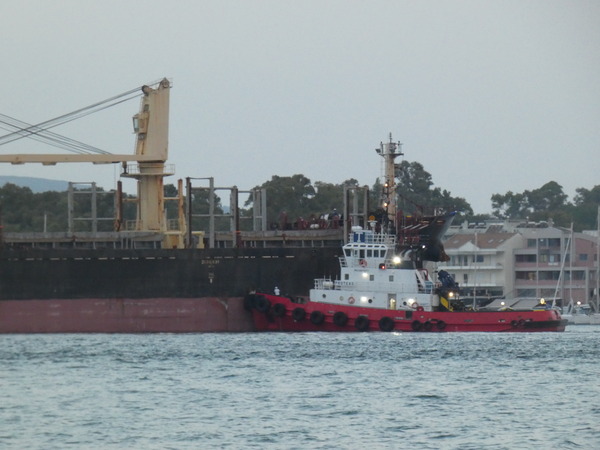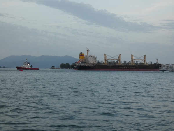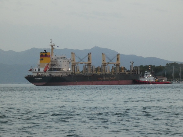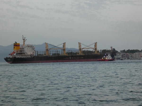 Nach dem Ankern am Vortag hatten wir ein Hafenkino der besonderen Art. Ein Frachter wurde mit Hilfe eines Schleppers vom Anlegedock in die Fahrrinne bugsiert, damit dieser dann in See stechen konnte.