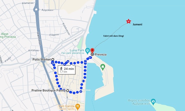Die zwei Tage in Preveza waren ausgefüllt mit ausgedehnten Spaziergängen, einem Besuch unserer Lieblingseisdiele und dem Einkaufen von Lebensmitteln und Trinkwasser.