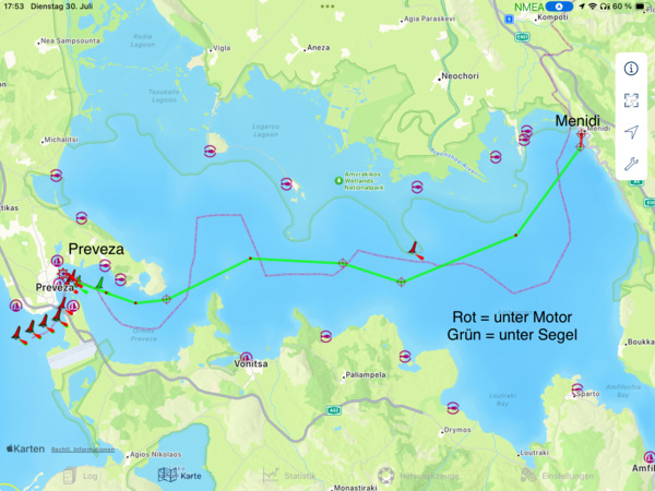 08.06.2024 Start: Griechenland, Ionisches Meer, Festland, Preveza Ziel: Griechenland, Festland, Ambrakischer Golf, Menidi Fahrzeit 4,7 Stunden, Strecke 19,4 sm davon 1,0 sm unter Motor und 18,4 sm unter Segel |