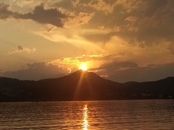Nach dem letzten Wettercheck mussten wir einen neuen Plan schmieden, die Schlechtwetterfront kam schneller als gedacht. Plan B war: wecken am nächsten Morgen um 2 Uhr, schneller Kaffee, Anker hoch und los ohne Zwischenstopp in unsere Schutzbucht bei Ermioni. Plötzlich war kein Wind mehr, aber dafür gab es eine ruhige See. Für die nächsten 50 sm mussten wir das Tuckern unseres Motors in Kauf nehmen. Sobald nur ein Hauch von Wind zu spüren war, setzten wir unser Lieblingssegel, den feuerroten Blister und konnten damit dann doch noch fast 20 sm segeln. Nach fast 17 Stunden und über 70 sm erreichten wir dann die Bucht Kapari bei Ermioni und setzten gut geschützt, für was da auch kommen sollte, unseren Anker mit ganz ganz ganz viel Kette. Wir waren nicht die einzigen, die sich diese Bucht ausgesucht hatten. Es waren noch 12 andere Segler vor Anker, aber alle mit guten und sicherem Abstand zu den anderen Booten.